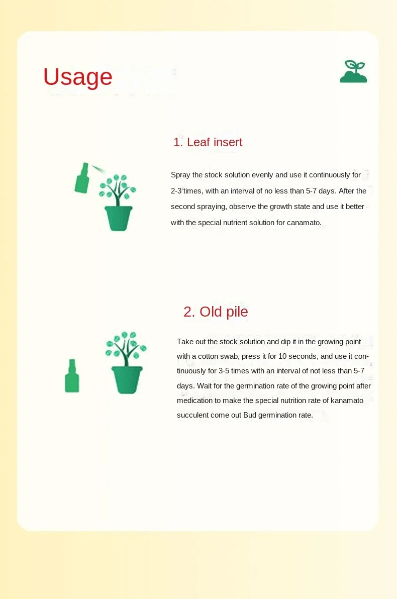 Spray the stock solution evenly and continuously for 2-3 times with an interval of no less than 5-7 days. After the second spray, observe the growth state.